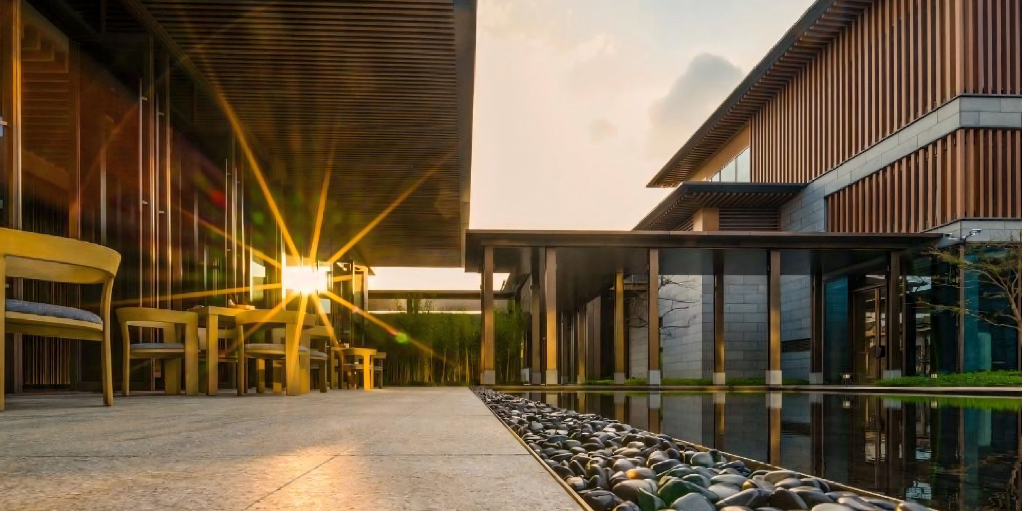 安吉英迪格酒店坐落在安吉逶迤的灵峰山脉中,距离灵峰寺800米,四周郁郁葱葱的竹林、起伏的小山、安吉著名的白茶田都恰到好处地成为了酒店的风景。酒店用地为西北高东南低的丘陵地形,项目总用地约29,000平方米,容积率1.03,酒店总共有客套房近150间。